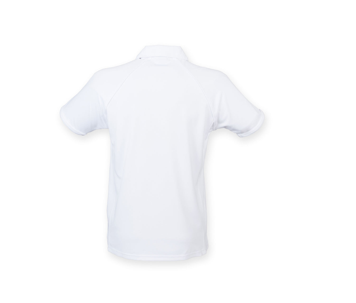 Piqué made of 100% Cool Plus® polyester for moisture management and wicking. Raglan sleeves and hem with white piping. Collar with two matching buttons.