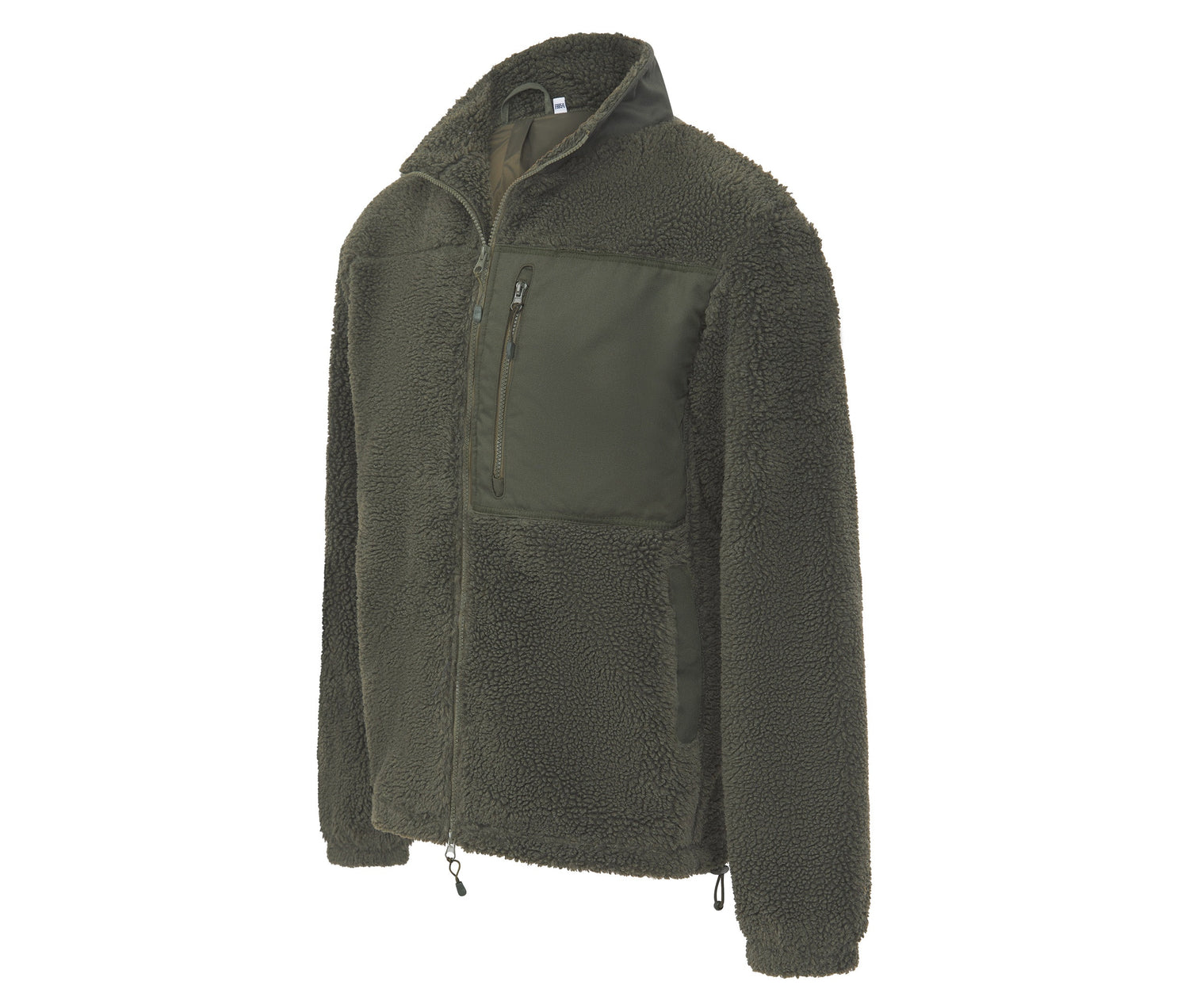 Kontrastierender Schornsteinkragen, innen mit Fleece gefüttert. Vordere Brusttasche mit Reißverschluss. Seitentaschen mit Druckknopfverschluss.