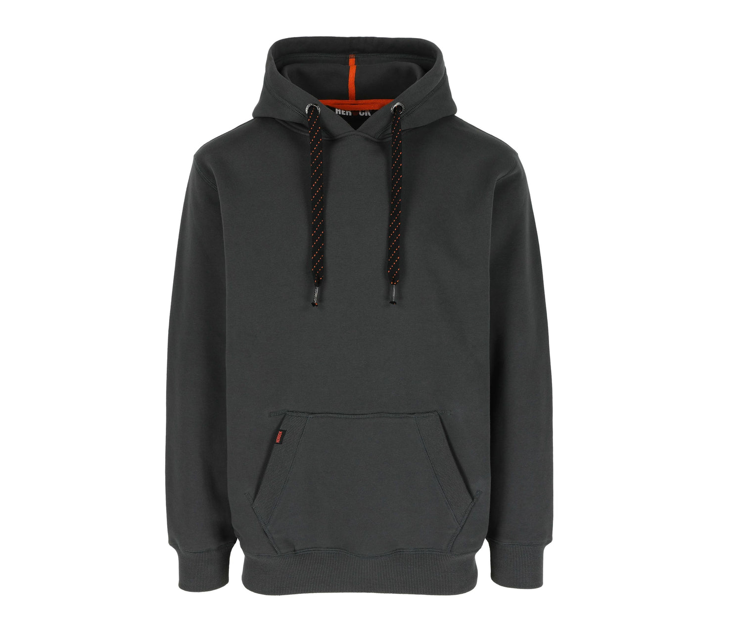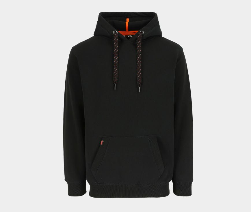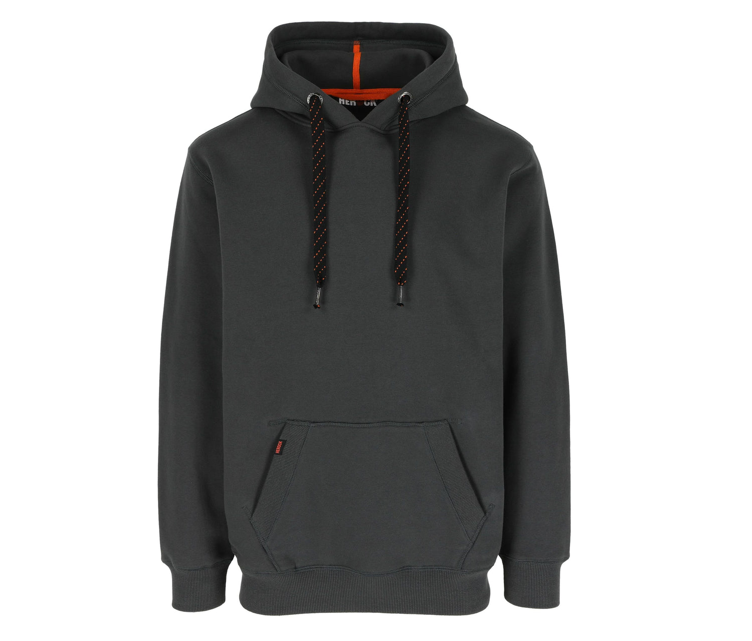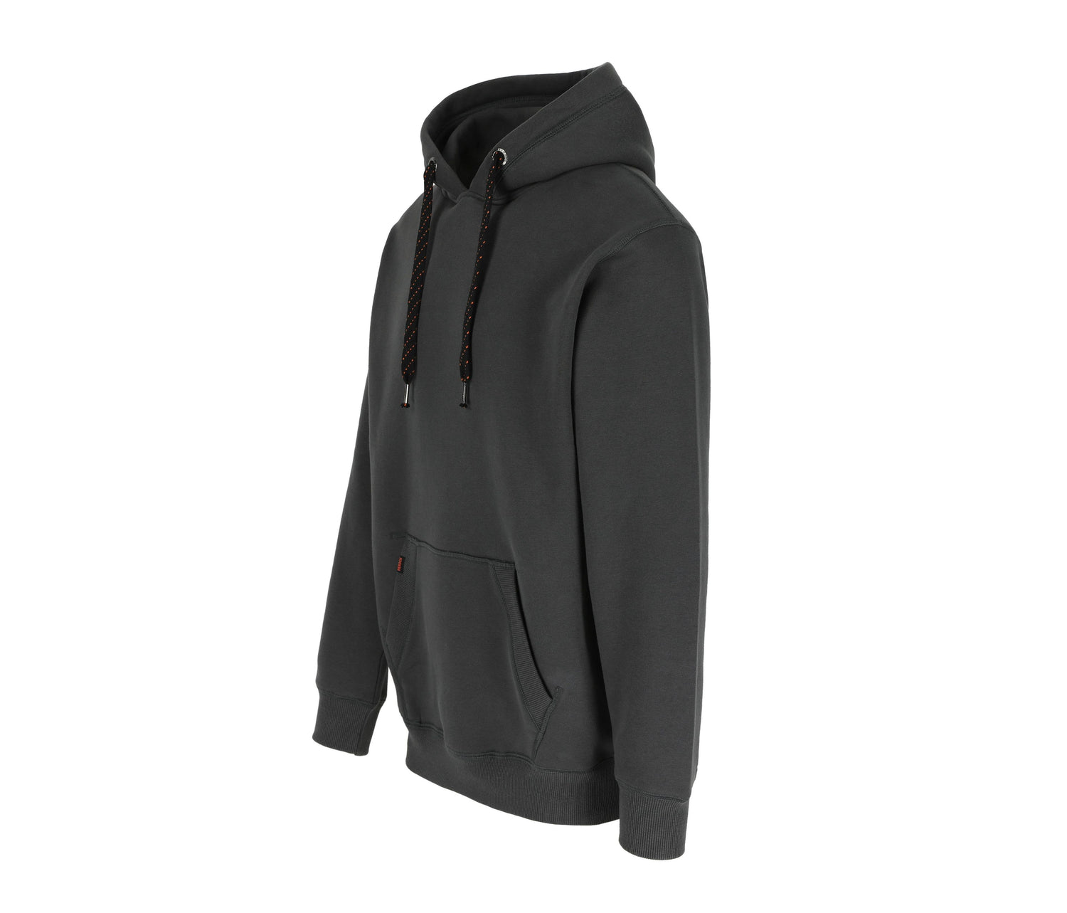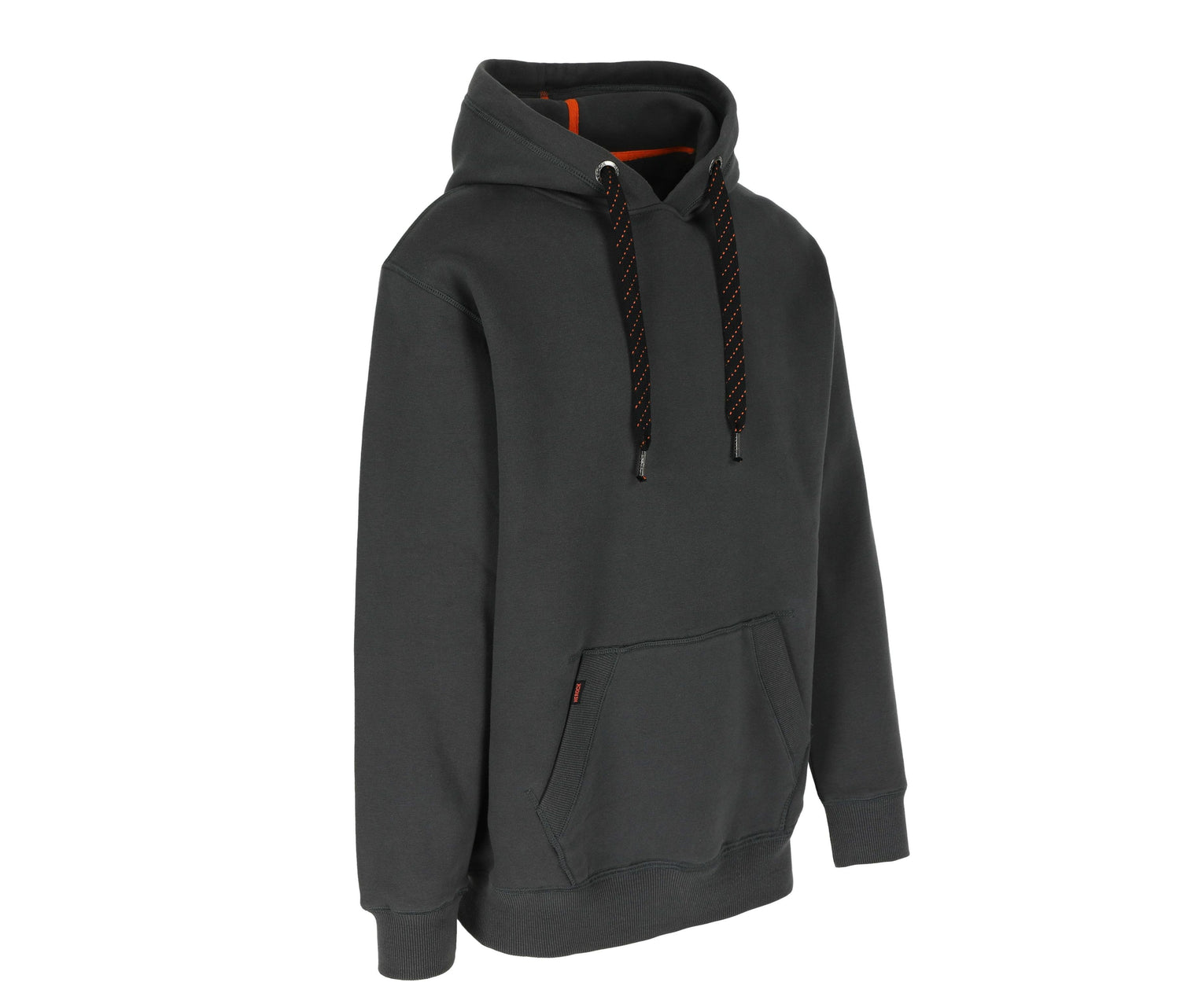 Känguru-Beutel. Bündchen und Taille mit Bündchen. Kapuze mit großem Kordelzug. Innen angeraut.