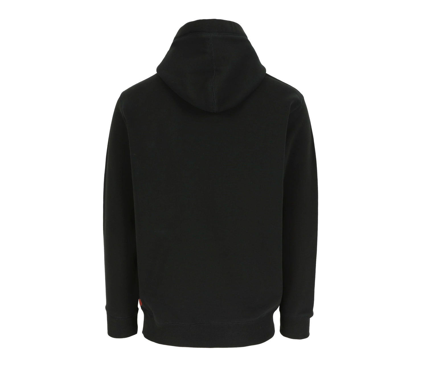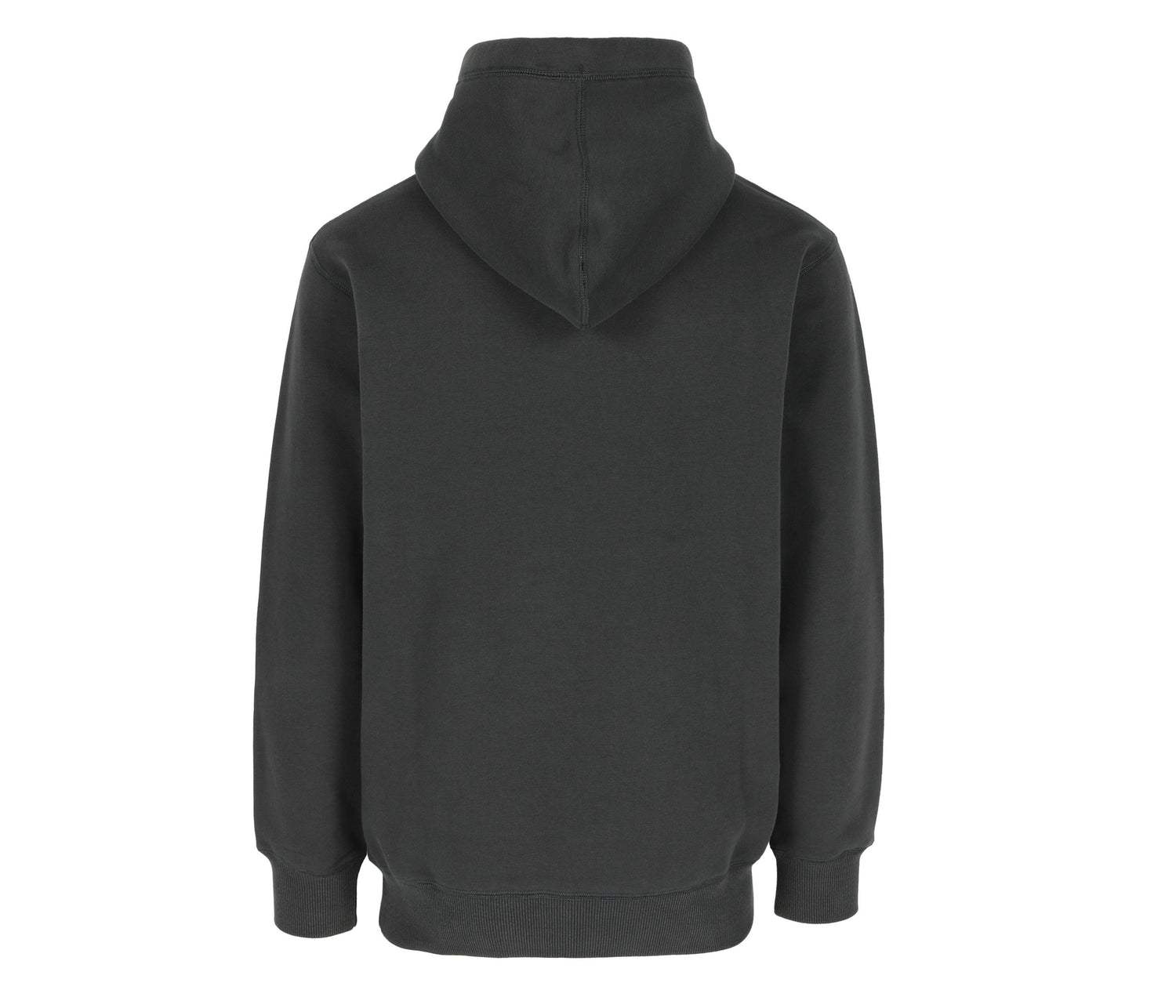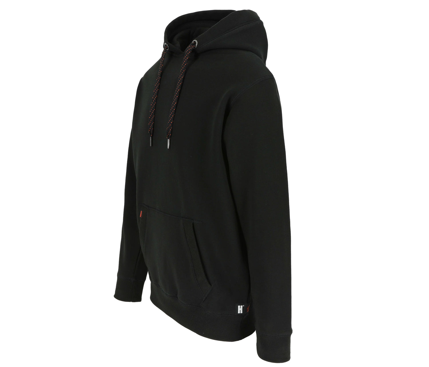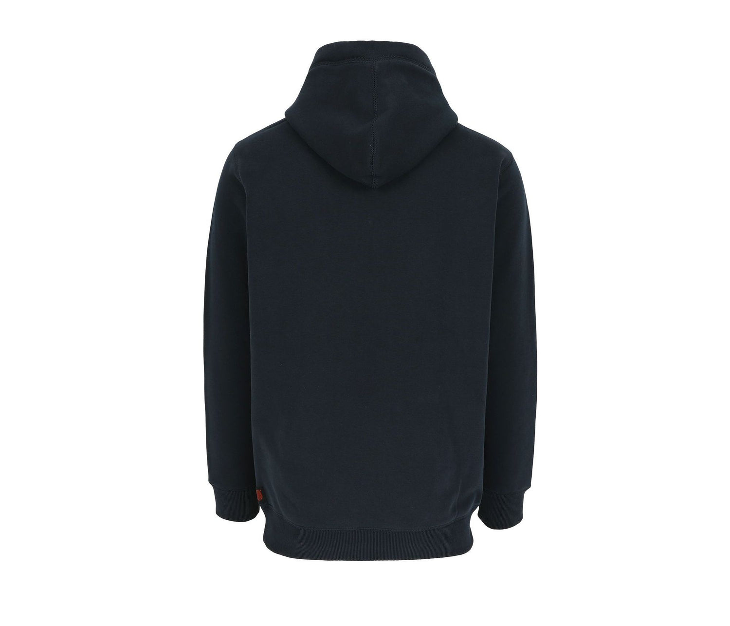 Känguru-Beutel. Bündchen und Taille mit Bündchen. Kapuze mit großem Kordelzug. Innen angeraut.