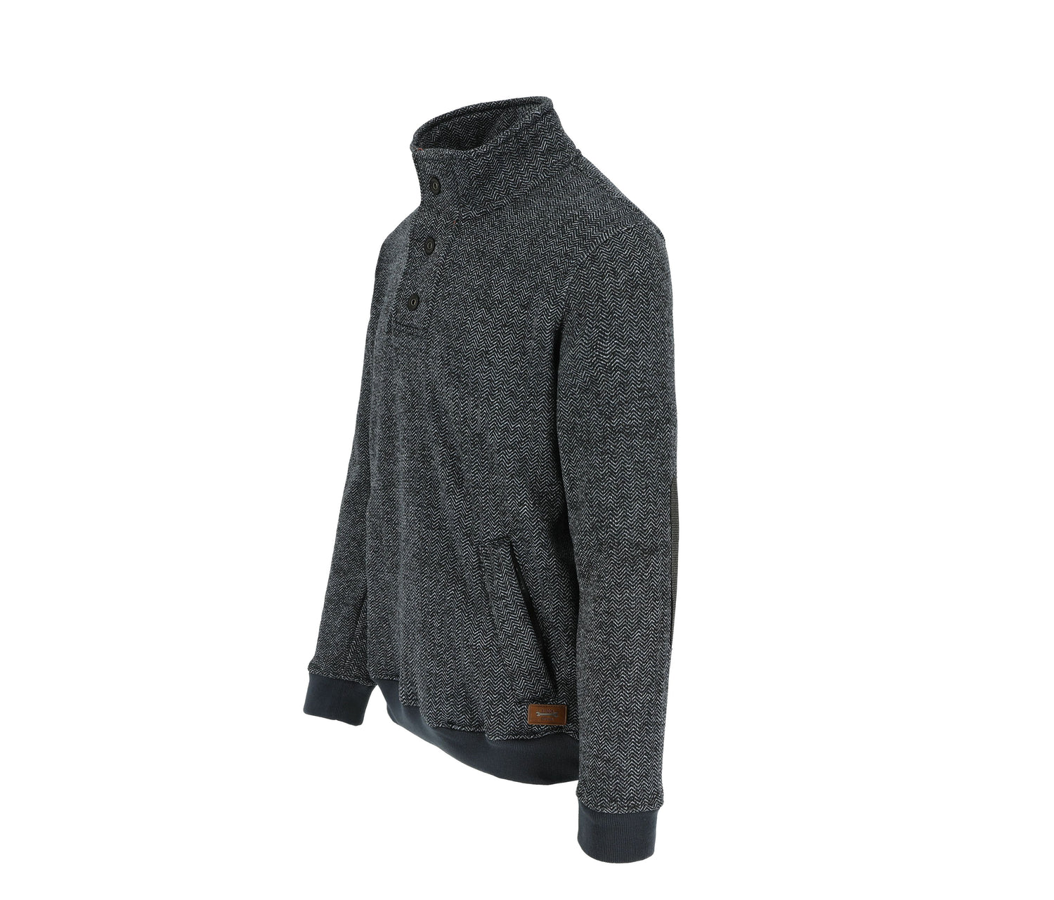 Kragen mit Druckknöpfen. 2 Seitentaschen. Ärmelbündchen und unten aus Rippstrick.