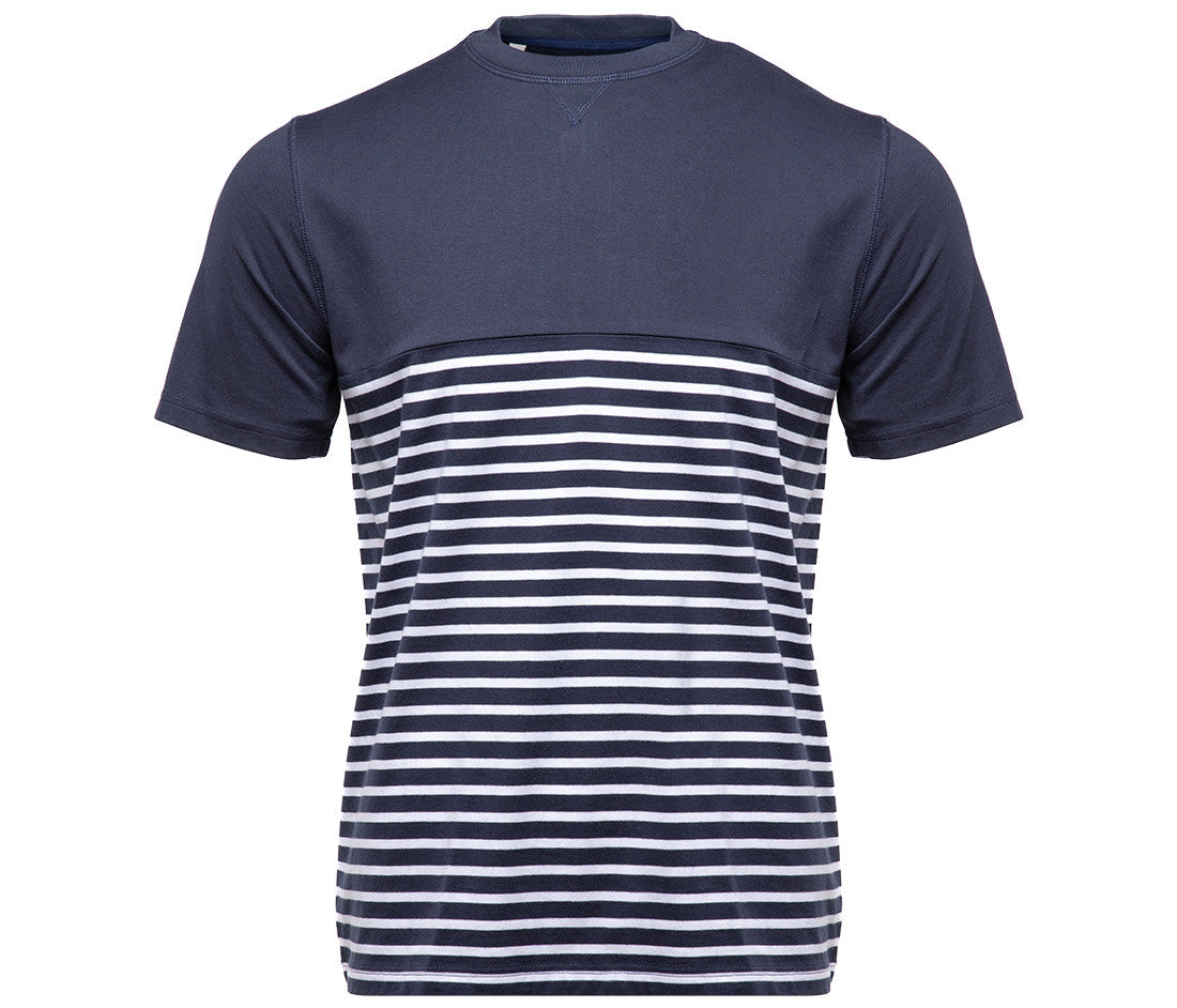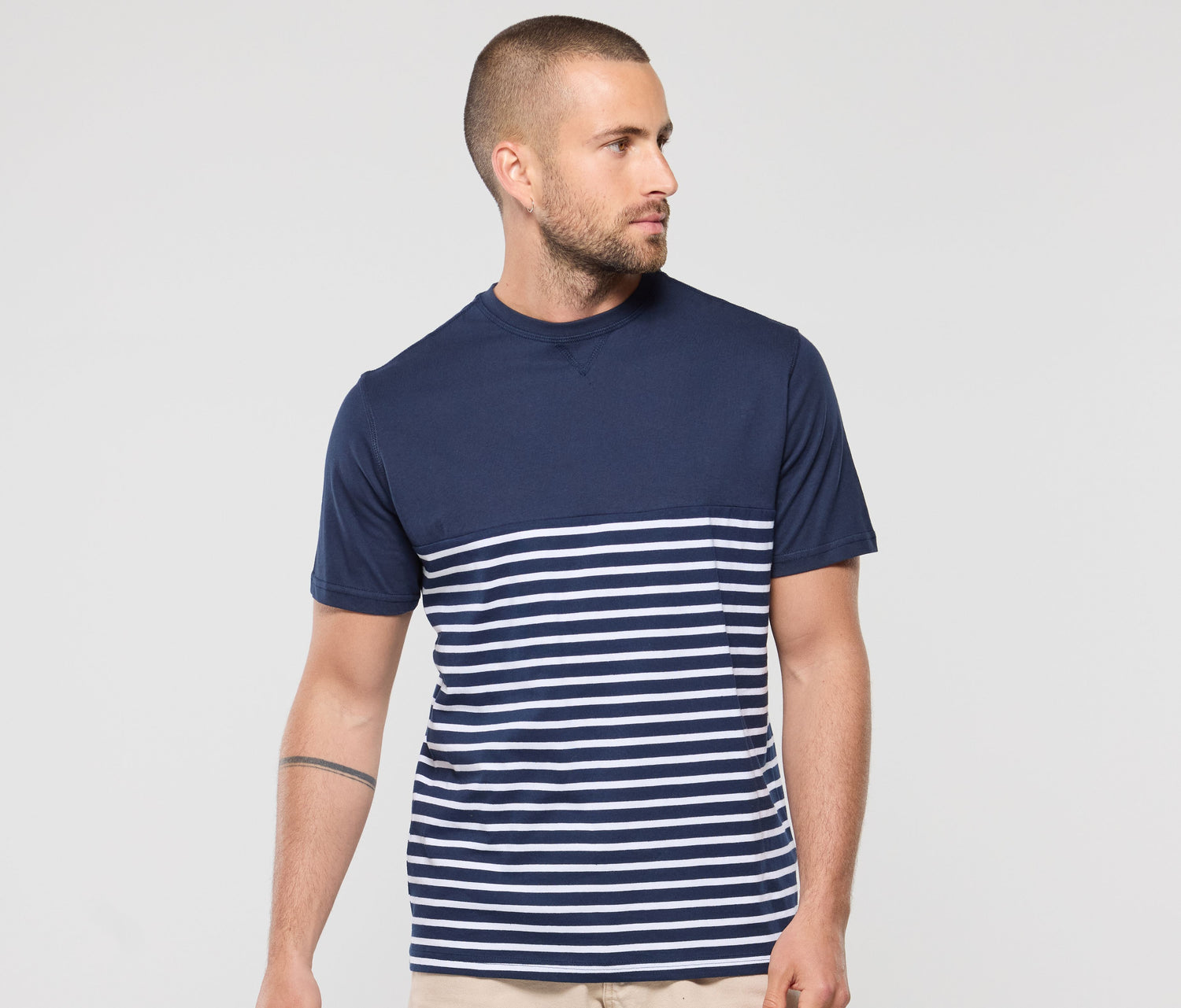 Kurze und angesetzte Ärmel. Streifen ab 20 cm vom Kragen. Kragen mit Elasthan.
