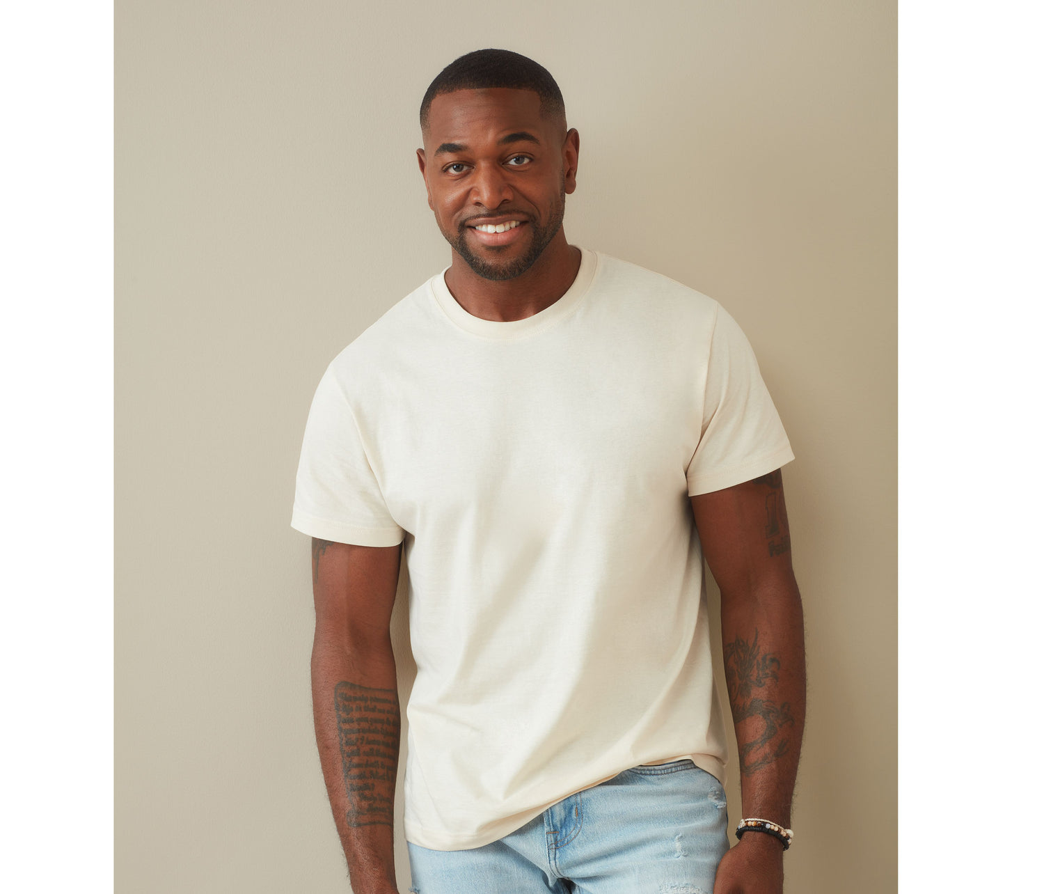 Das beliebte Schwergewicht aus strapazierfähiger Ringspinn-Baumwolle: Weiches, mittelschweres Herren-Kurzarm-T-Shirt ohne Seitennähte. Größen- und Pflegeetikett im Nacken.