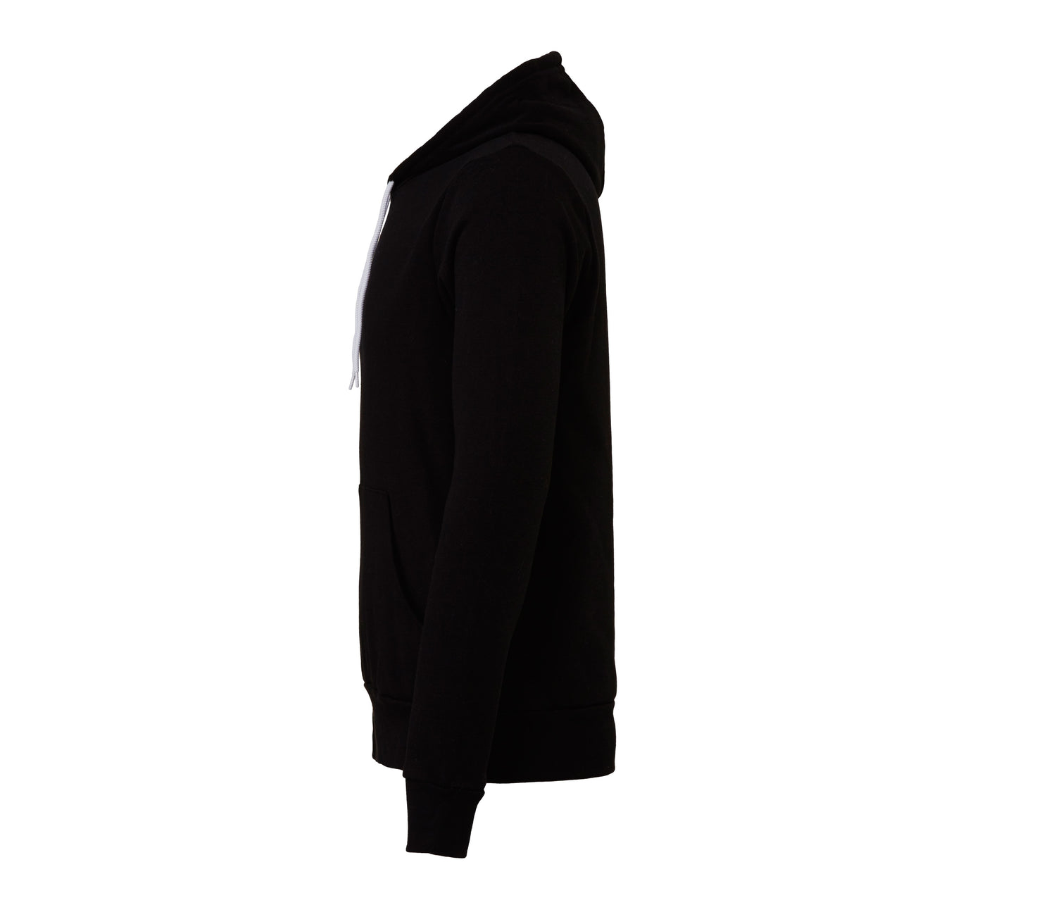 Seitliche Nähte. Unisex-Modell. Kängurutasche. Weiße Kordeln. Innen angeraut.