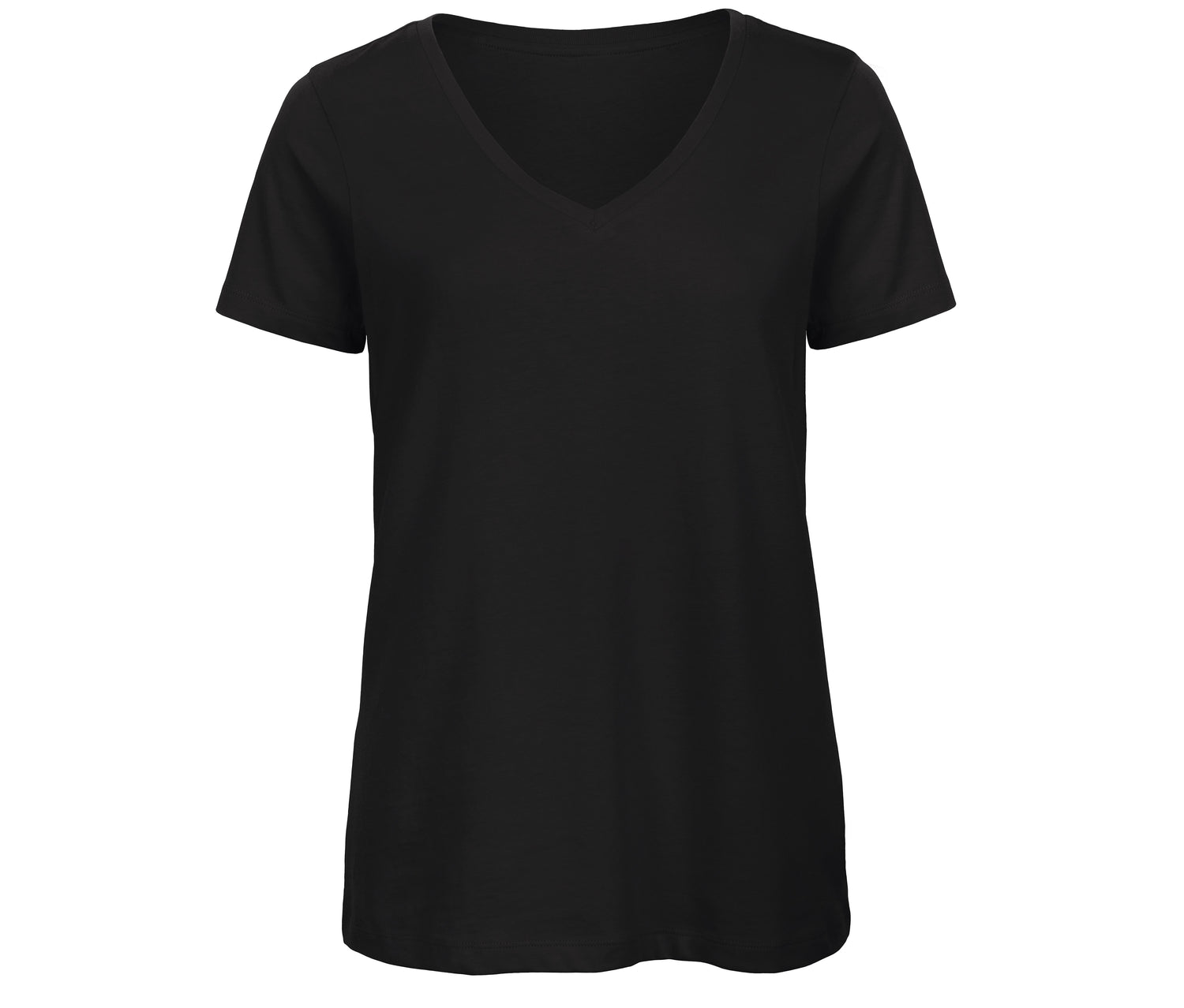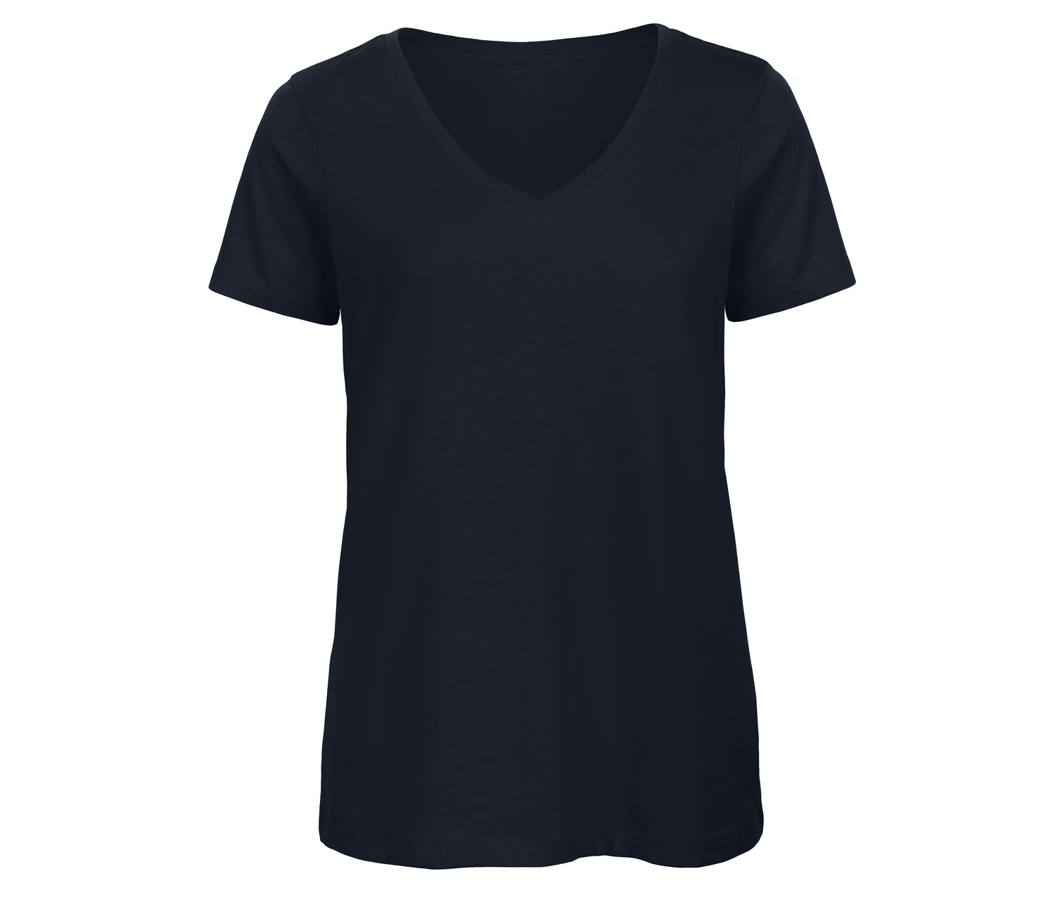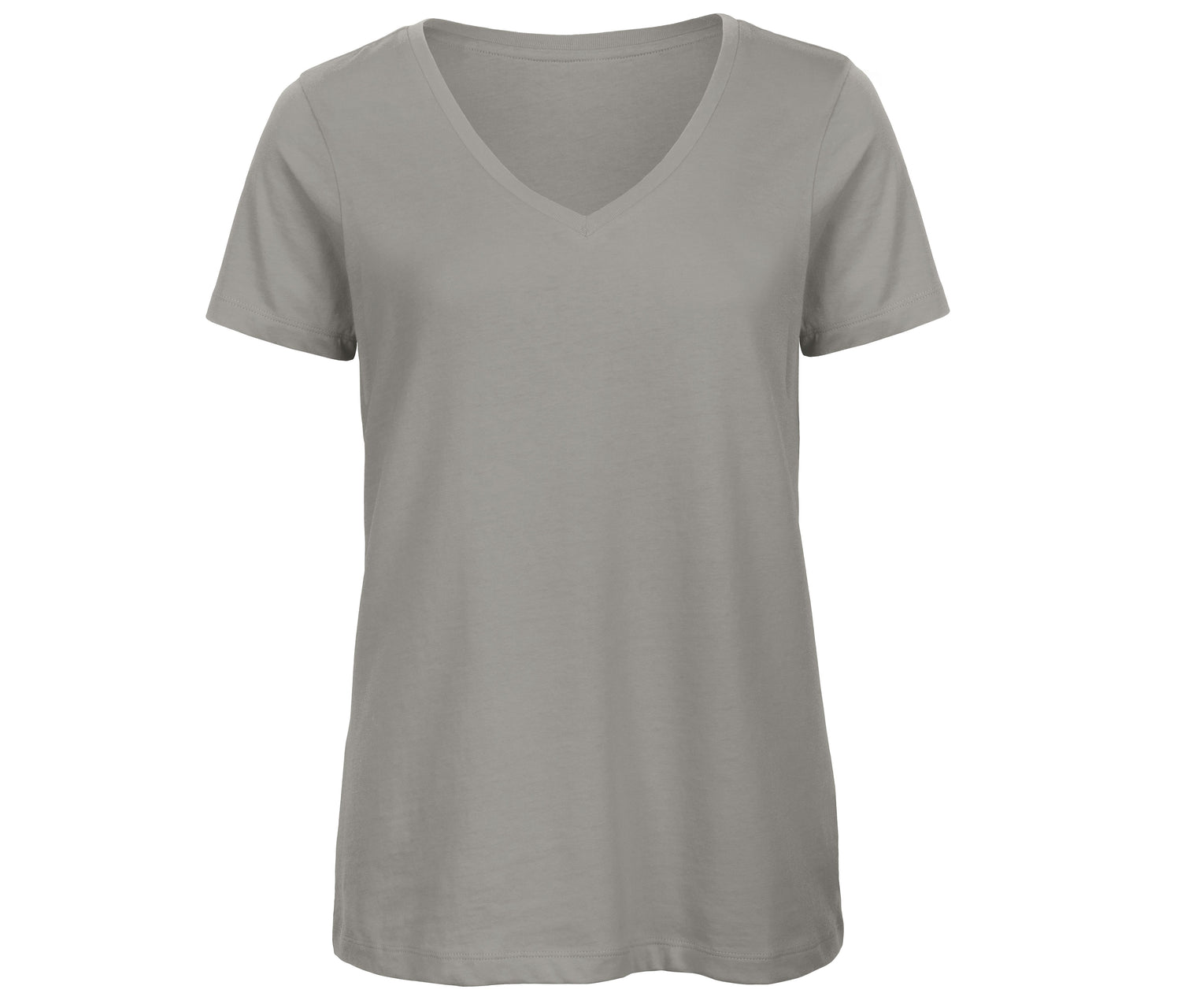 T-Shirt für Damen mit V-Ausschnitt aus Bio-Baumwolle oder Bio in Konversion. Seitennähte. Modischer Schnitt. Glatte Oberfläche für einen klaren und präzisen Druck. Ohne Label.