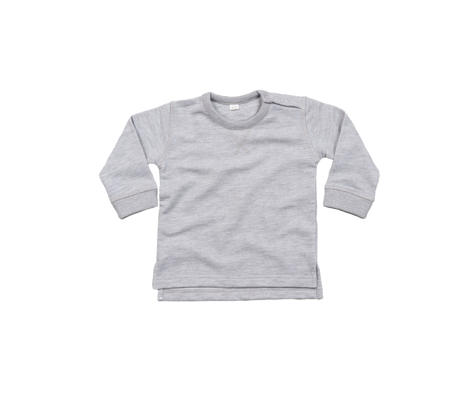 Round neckline with two snap fasteners on the shoulder. Ribbed cuffs at the neck and sleeves. Side slits.