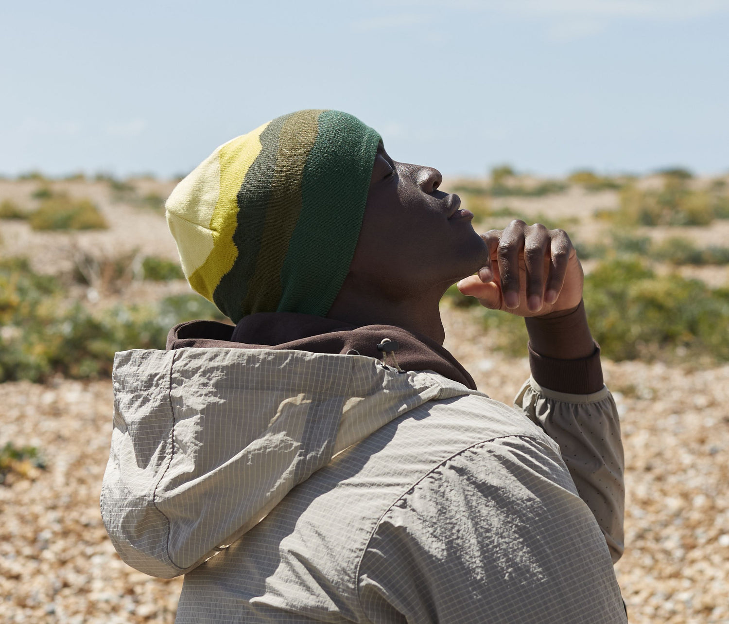Contains at least 50% recycled polyester. Large mountain landscape design. Double-layered. Removable label.