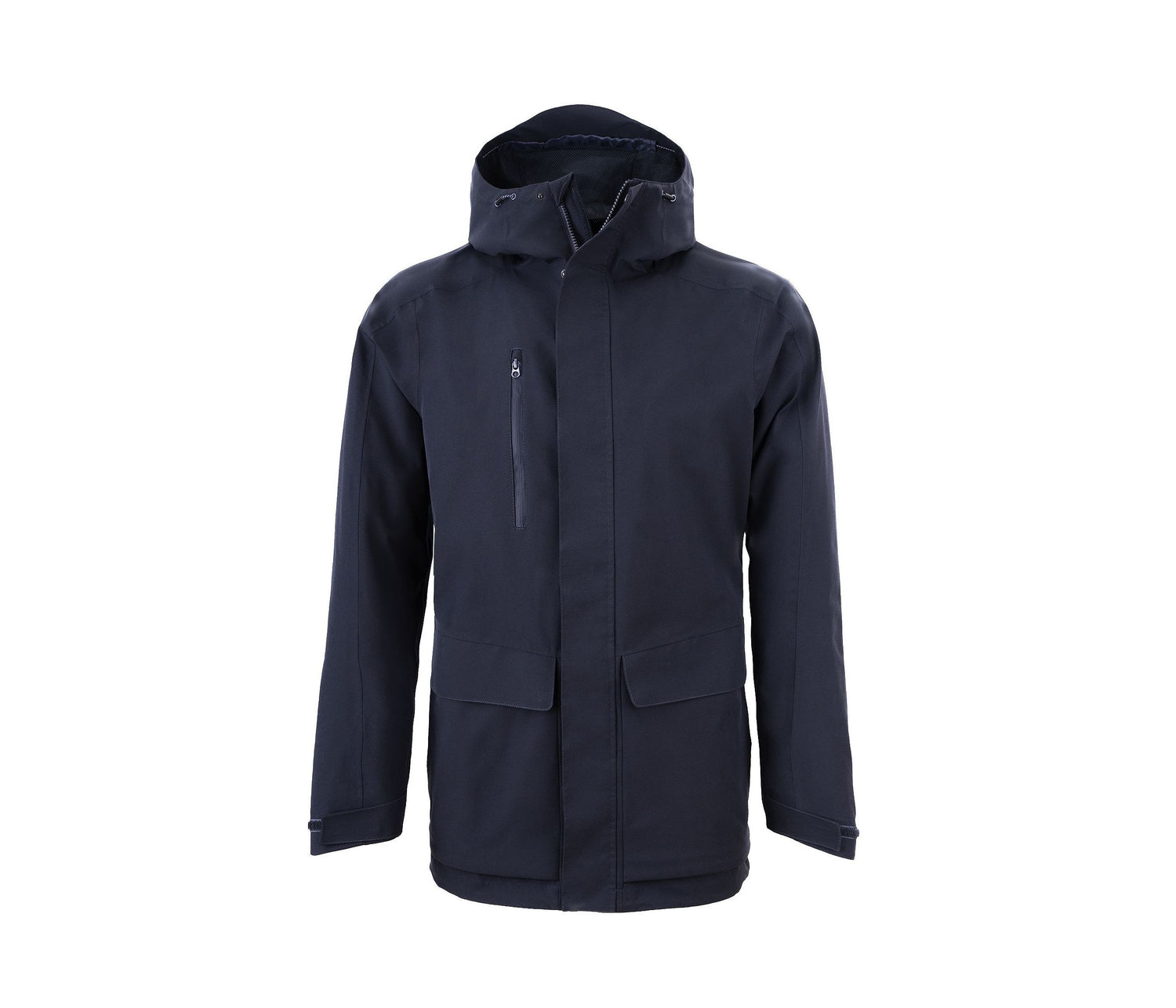 Waterproof (10,000 mm) and breathable (20,000 g/m² 24H) jacket. Full-length zipper. 6 pockets.