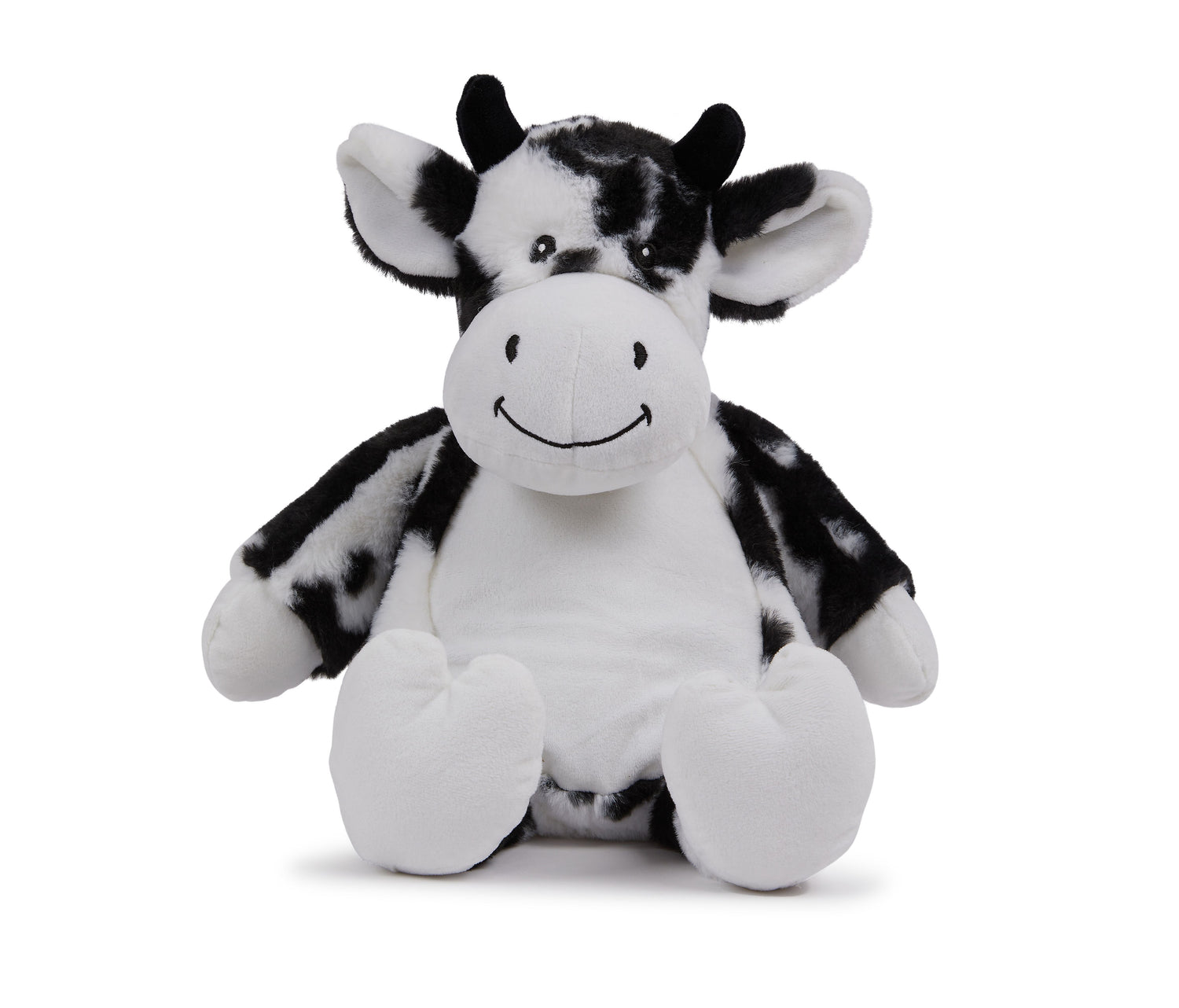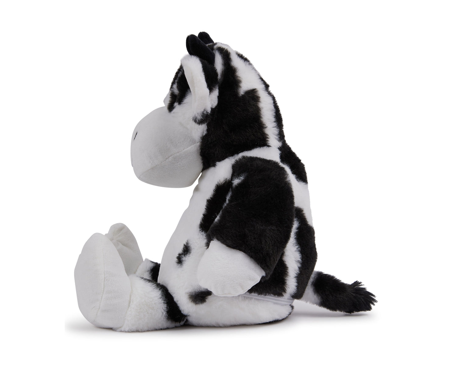Cow with contrasting face and hooves. Stitched eyes and mouth. Zippered access at the bottom for direct access to the belly.