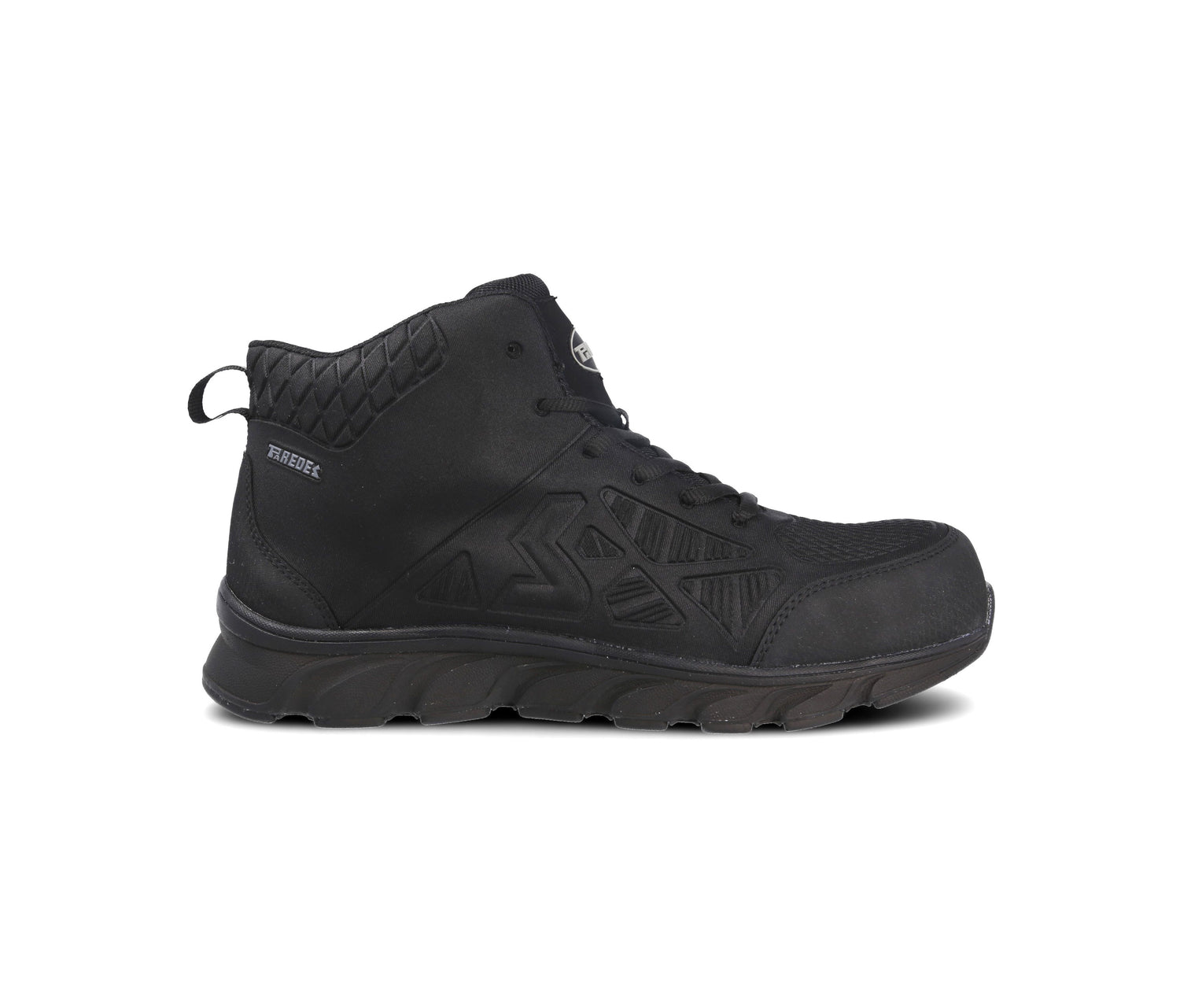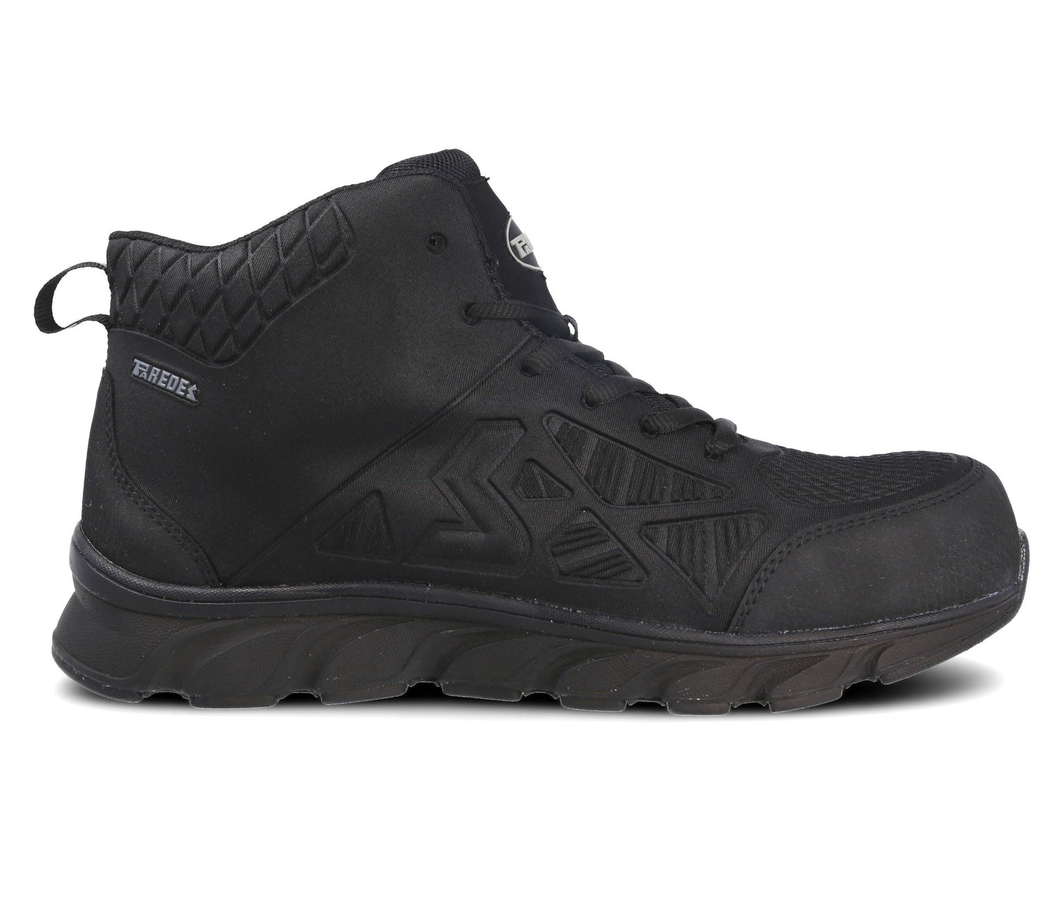 High-top safety shoes with a non-metallic COMPACT® toecap, impact resistance >200 joules. EVA and SRC nitrile rubber sole with anti-slip properties. COMPACT® non-metallic instep, puncture-resistant >1000N.
