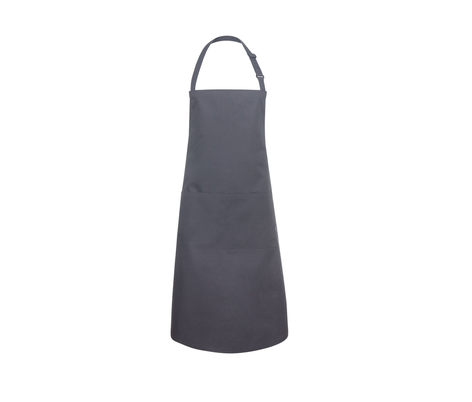 Bib apron with self-fabric ties. Patch pocket with two compartments (40x20 cm). The ties are adjustable up to 70 cm in length. The ties have buckles.