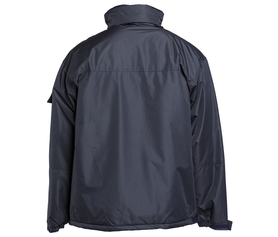 Windproof, breathable, and waterproof. Hood tucked into the collar. One chest pocket and two zippered side pockets.