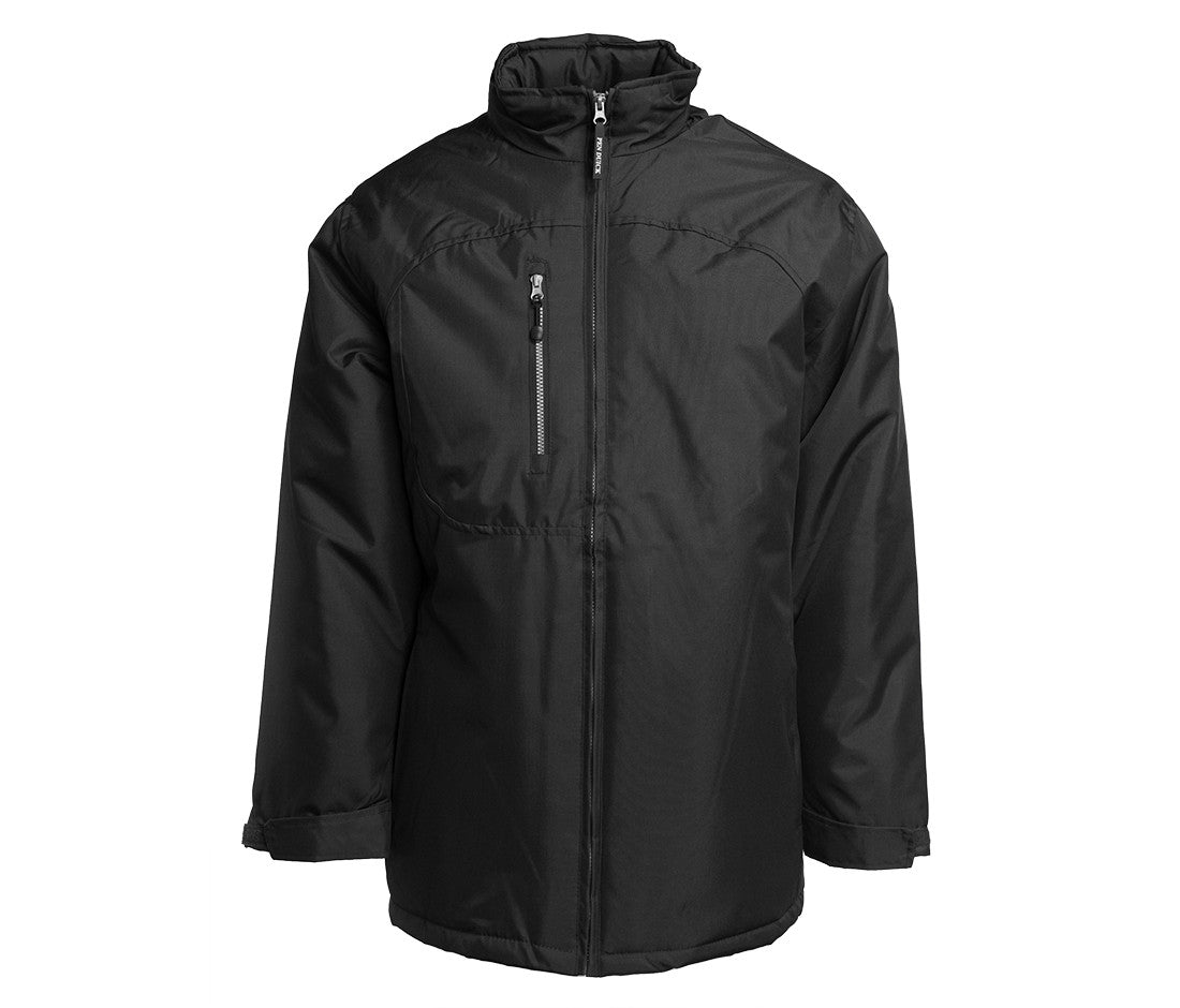 Windproof and waterproof 1000mm. Hood integrated into the collar, adjustable with stoppers. Snug fit.