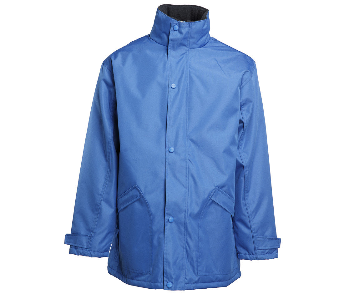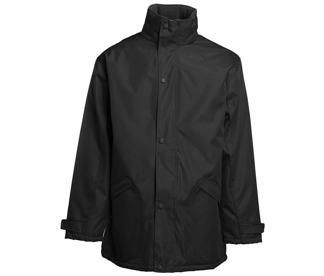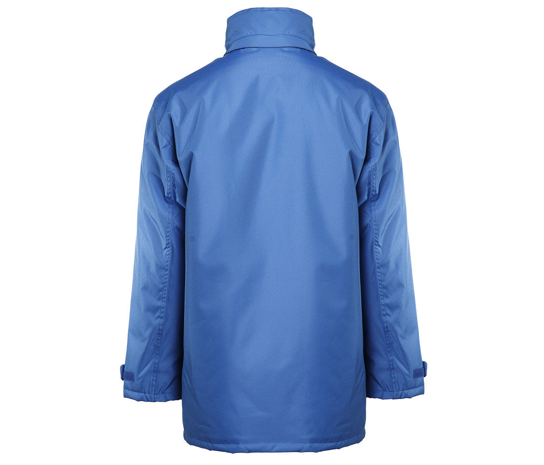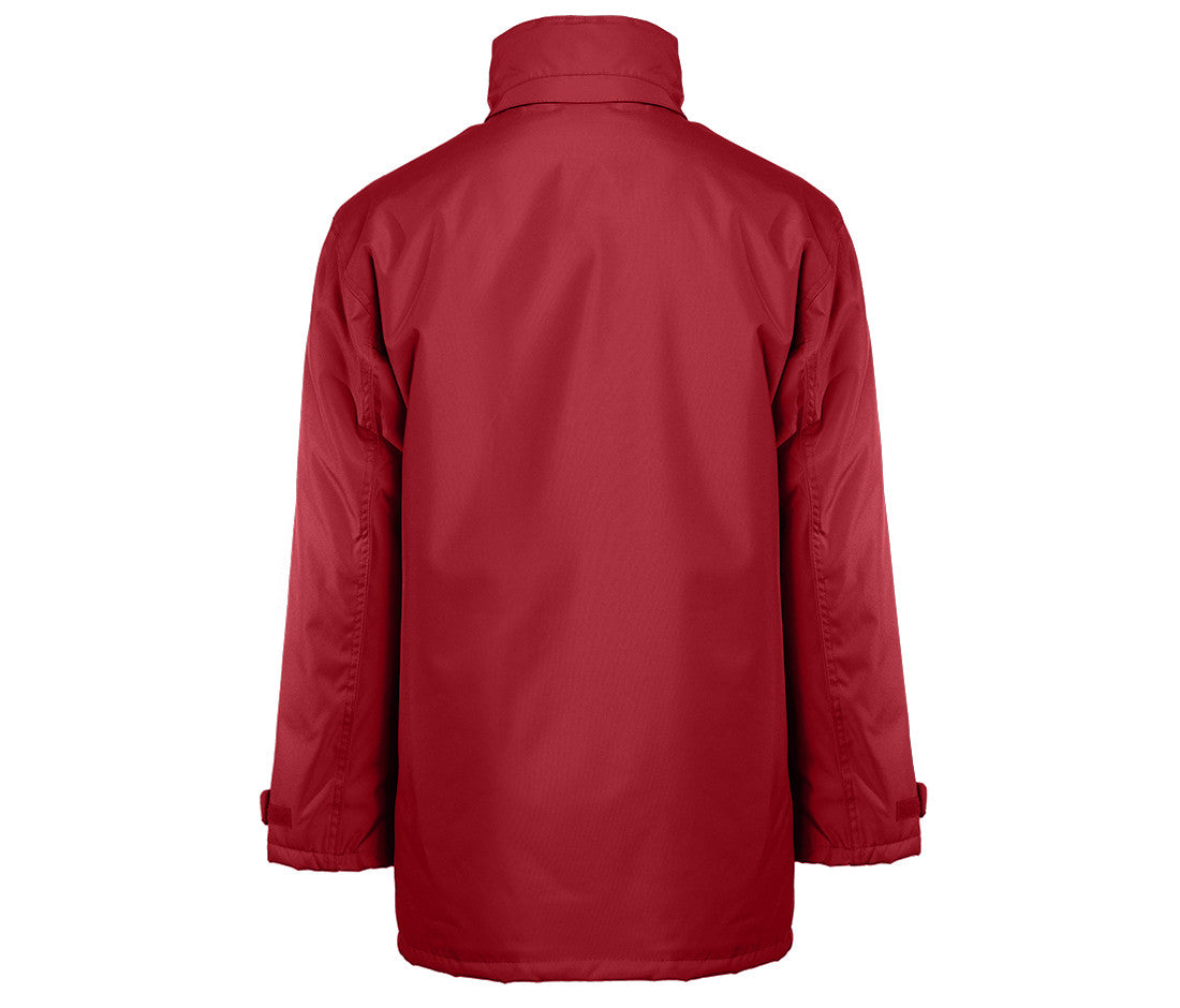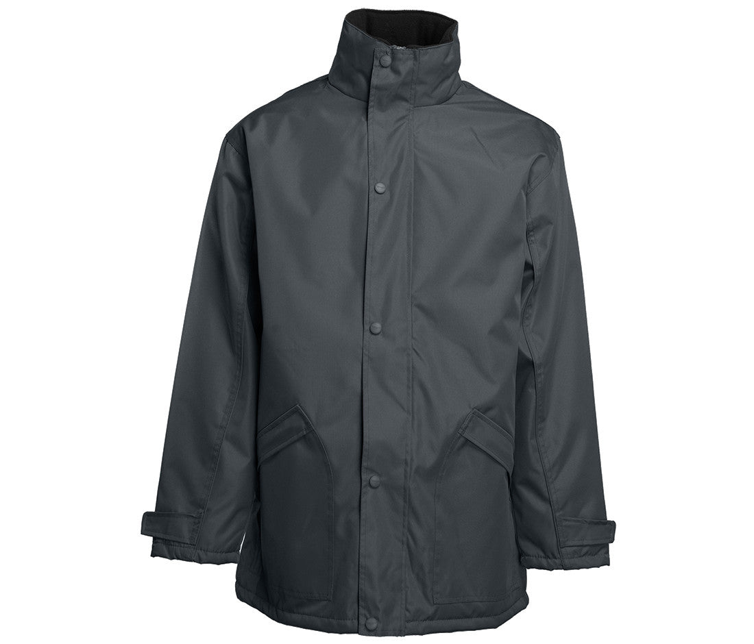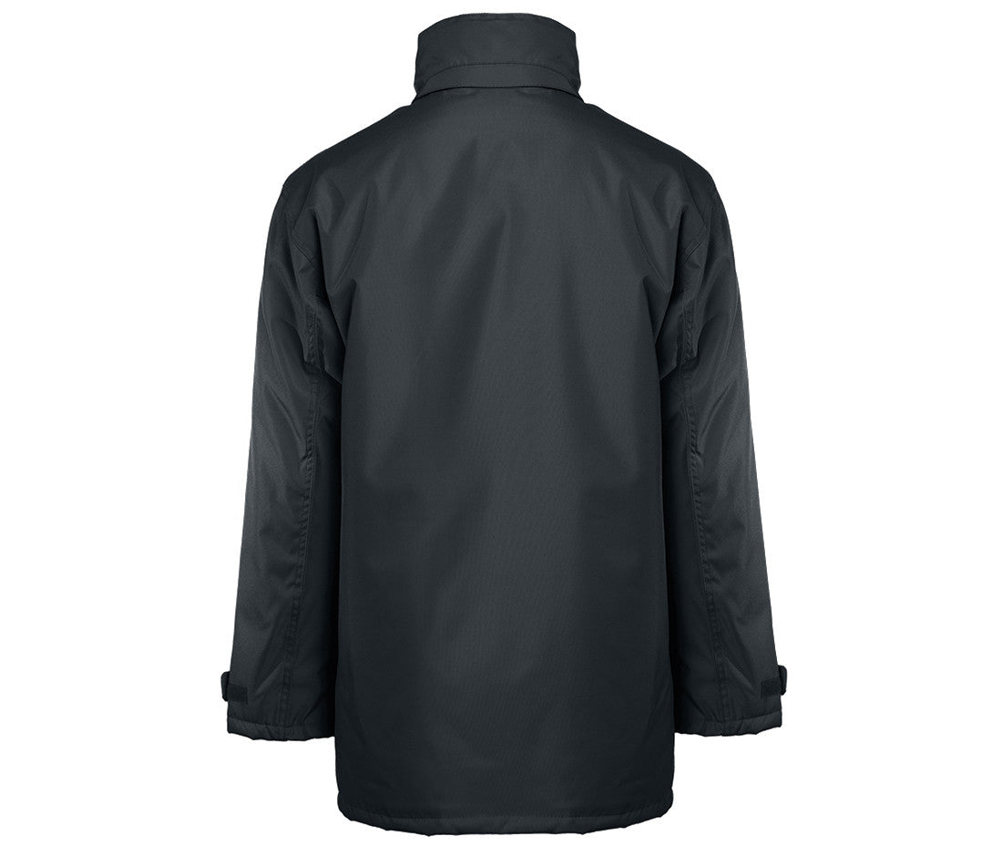 Windproof with a 1000mm waterproof coating. Two zippered outer pockets and two inner pockets (wallet and phone). A hood is tucked into the collar.