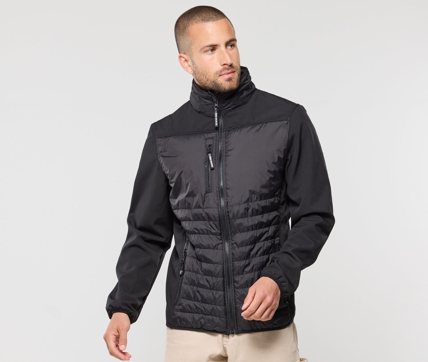 This dual-material jacket (polyester ripstop and 3-layer softshell) is water-repellent and windproof. Hoods are available (ref. PK995, ref. PK996, and ref. PK997) (zipper hidden in the collar).