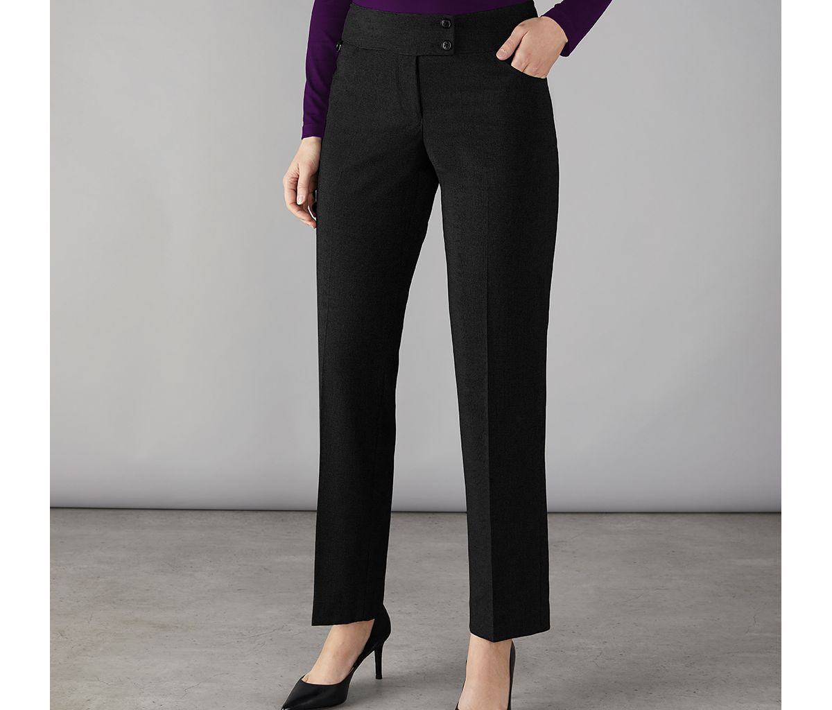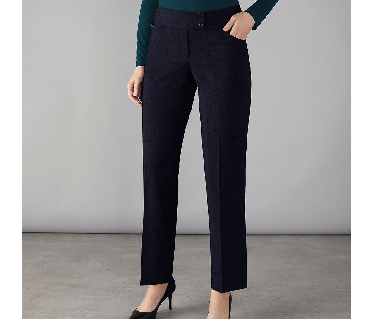 Women's trousers with pressed pleats. Zipper fly with buttons. Slim fit.