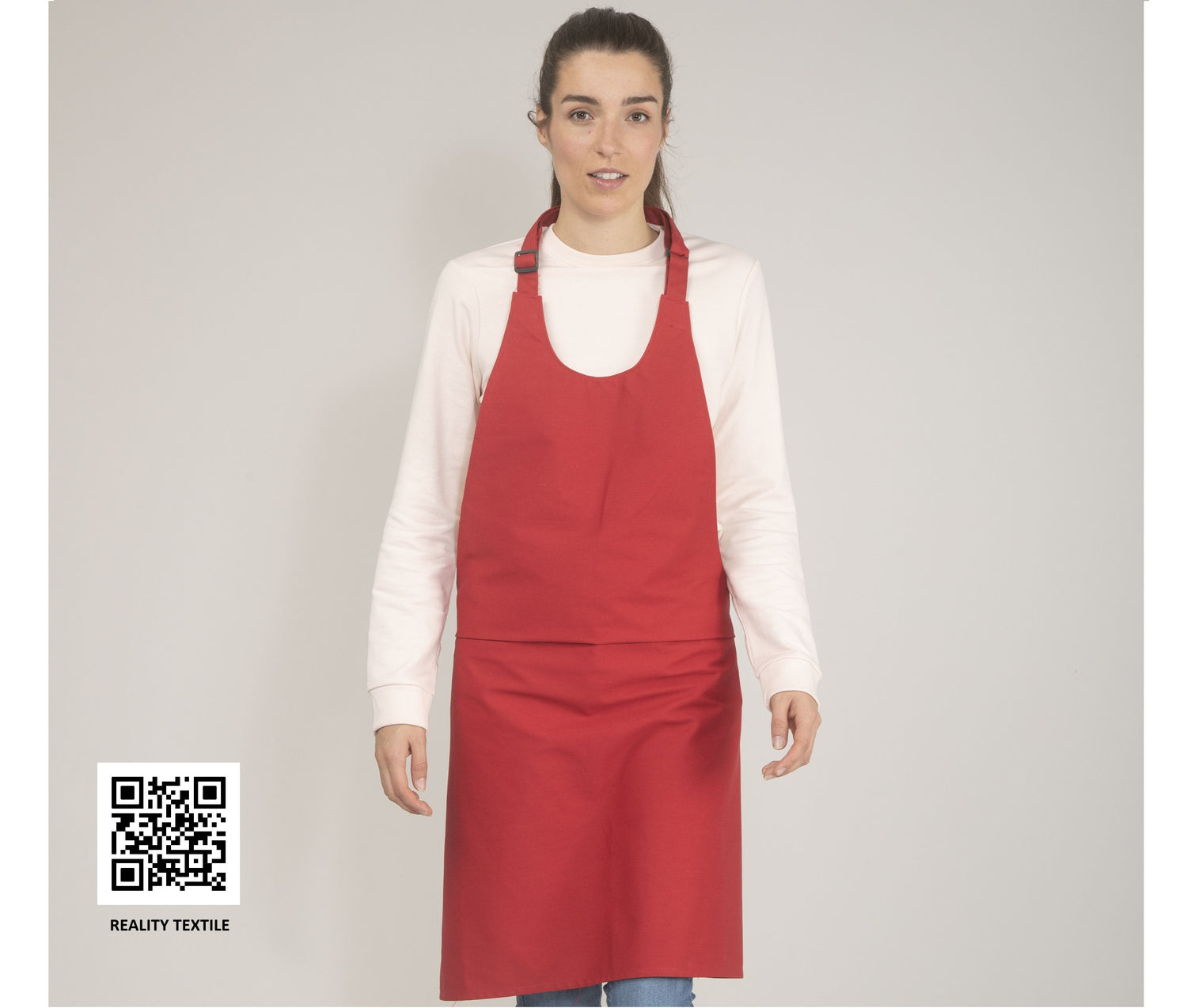 Apron without pocket. Height: 90 cm. Width: 75 cm. Plastic buckle for adjusting the strap. Washable up to 60°C.