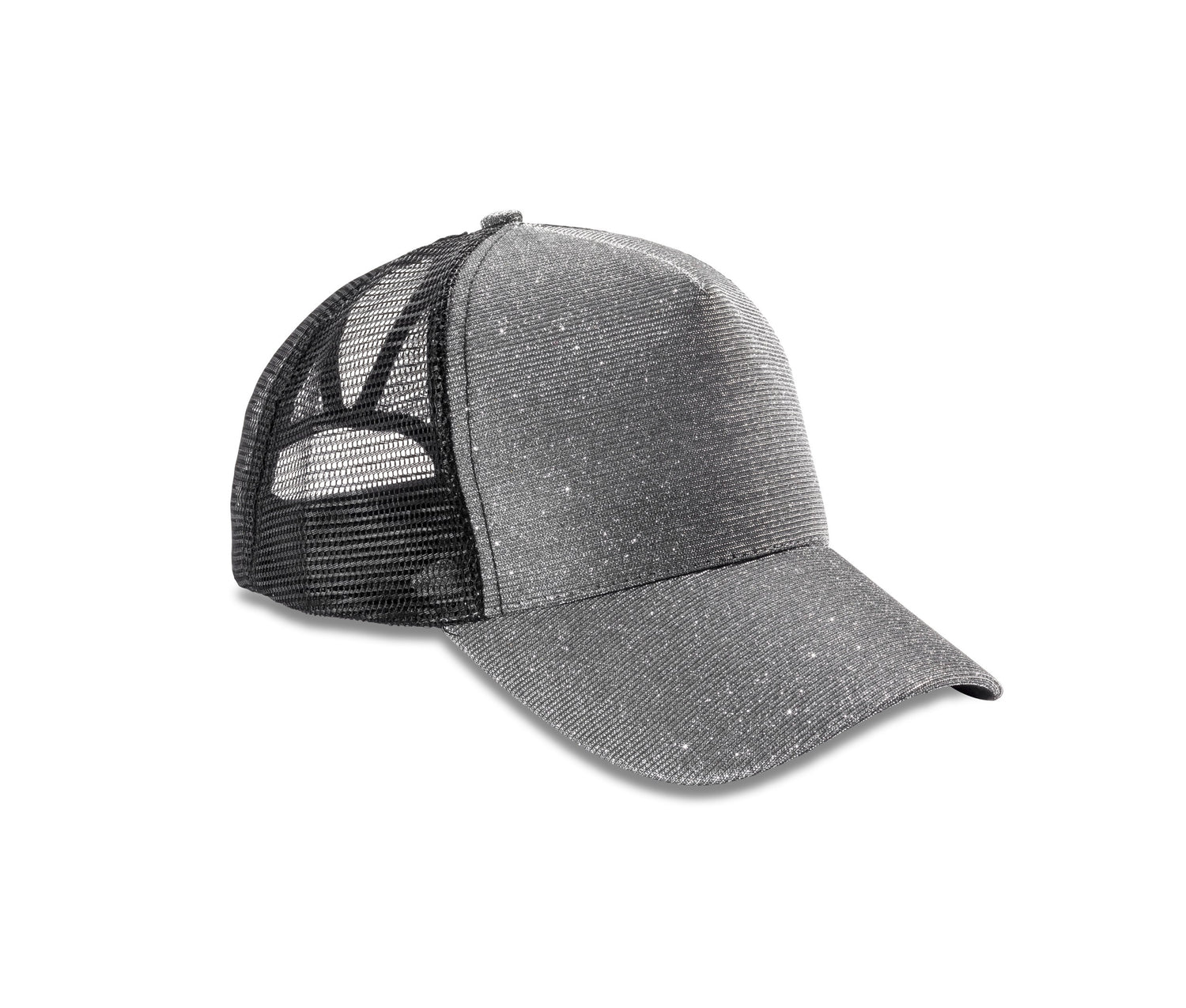 5-panel cap: 4 mesh panels, 1 sequin-padded panel. Adjustable with hook-and-loop fastener. Shaped visor.