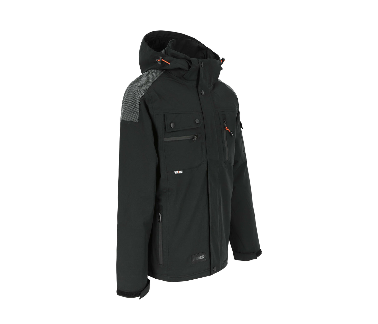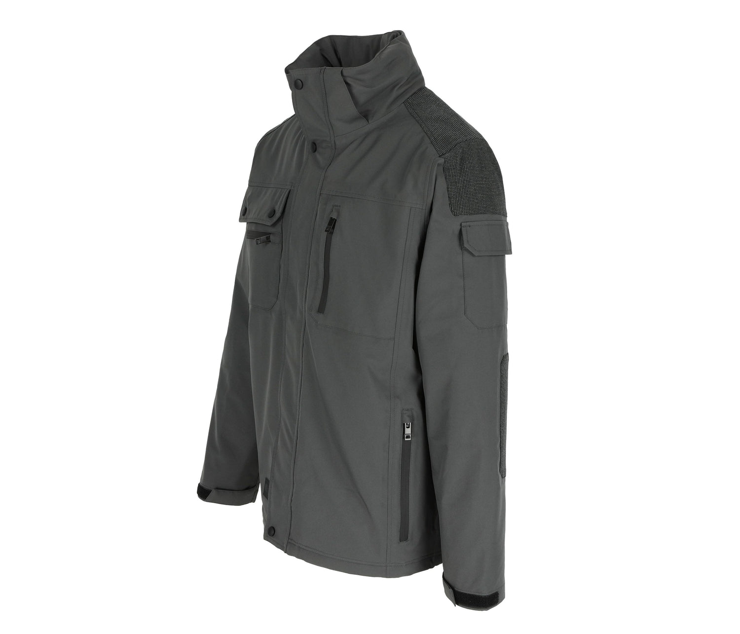 Jacket with multiple pockets, breathable and waterproof. Reinforced panels at the shoulders and elbows. Adjustable hood, cuffs, and hem.