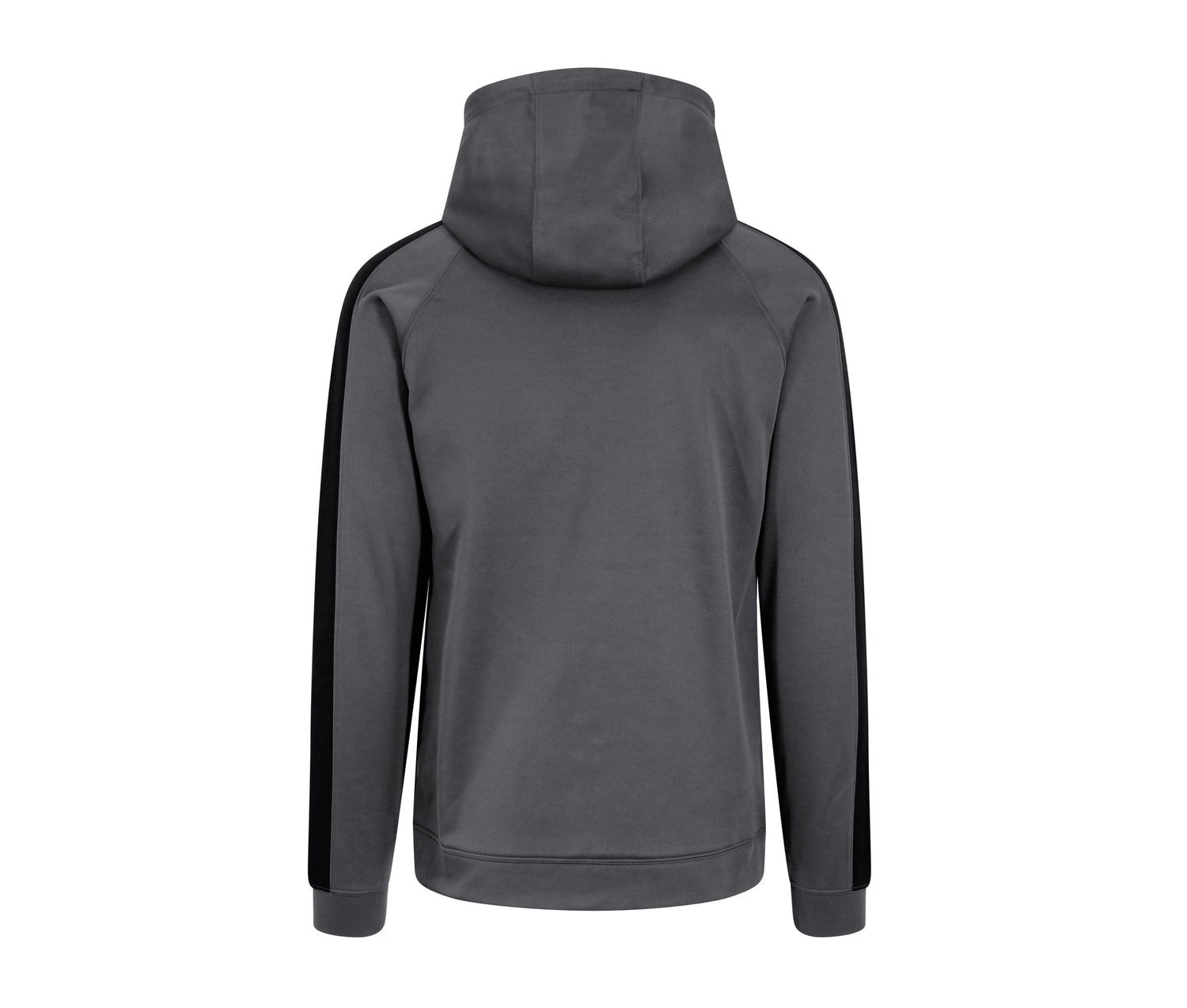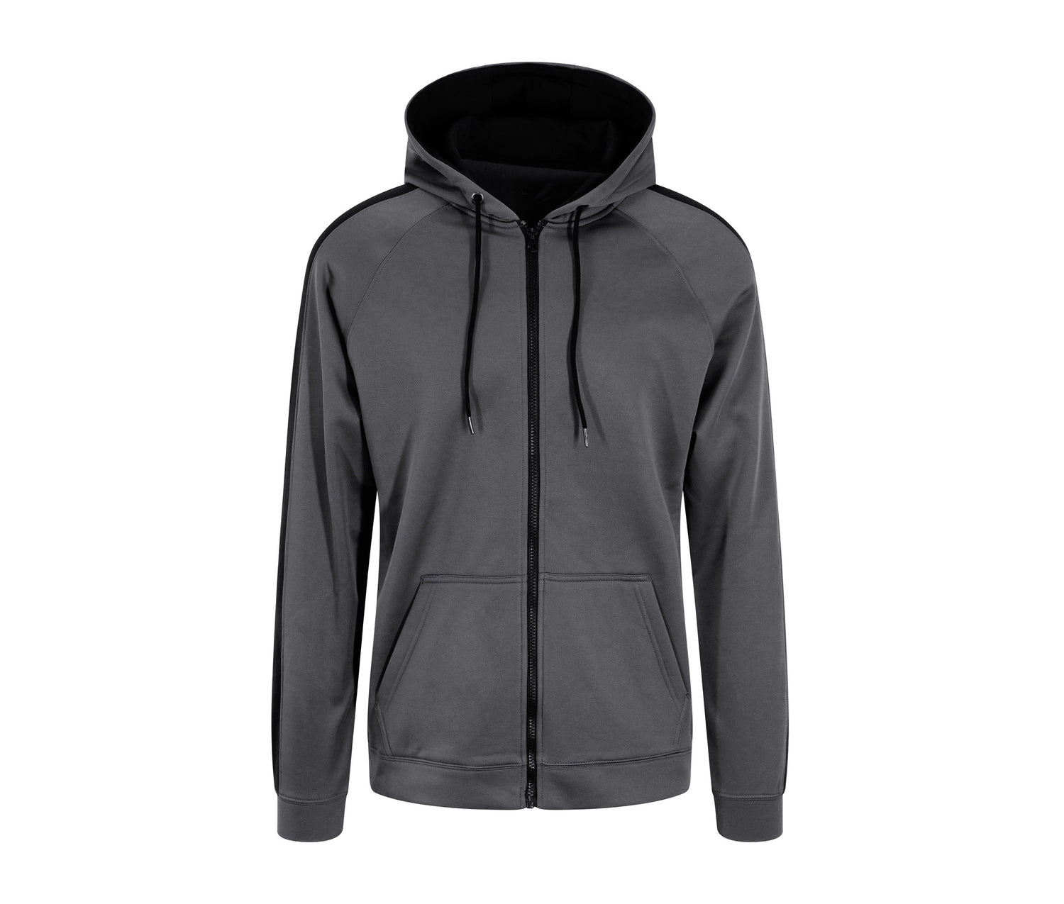 Contrasting plastic zipper. Raglan sleeves with contrasting trim. Three-panel hood with contrasting lining. Brushed interior.