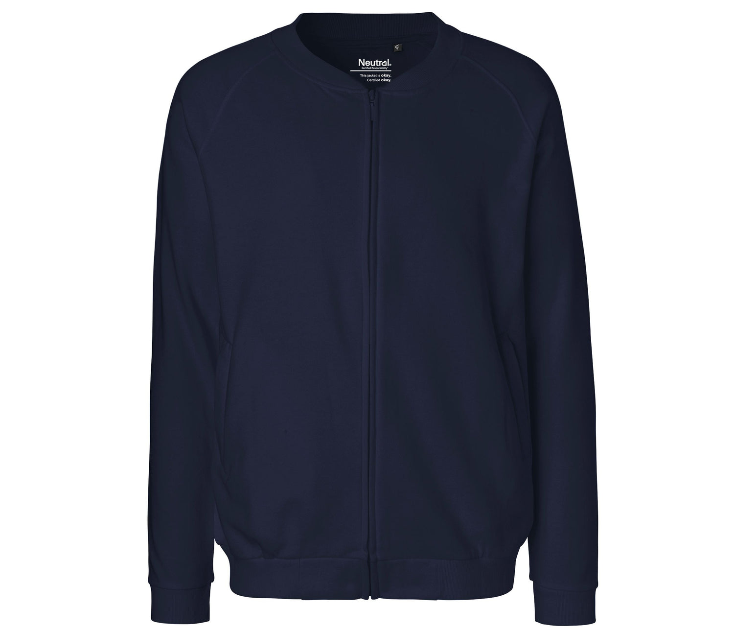 Brushed fleece interior. Full-length zipper in self-fabric. Side pockets with color-coordinated zippers. Ribbed cuffs and hem with Lycra®. GOTS, Fairtrade, EU Ecolabel, SA8000, and Oekotex certified. Produced with wind power.