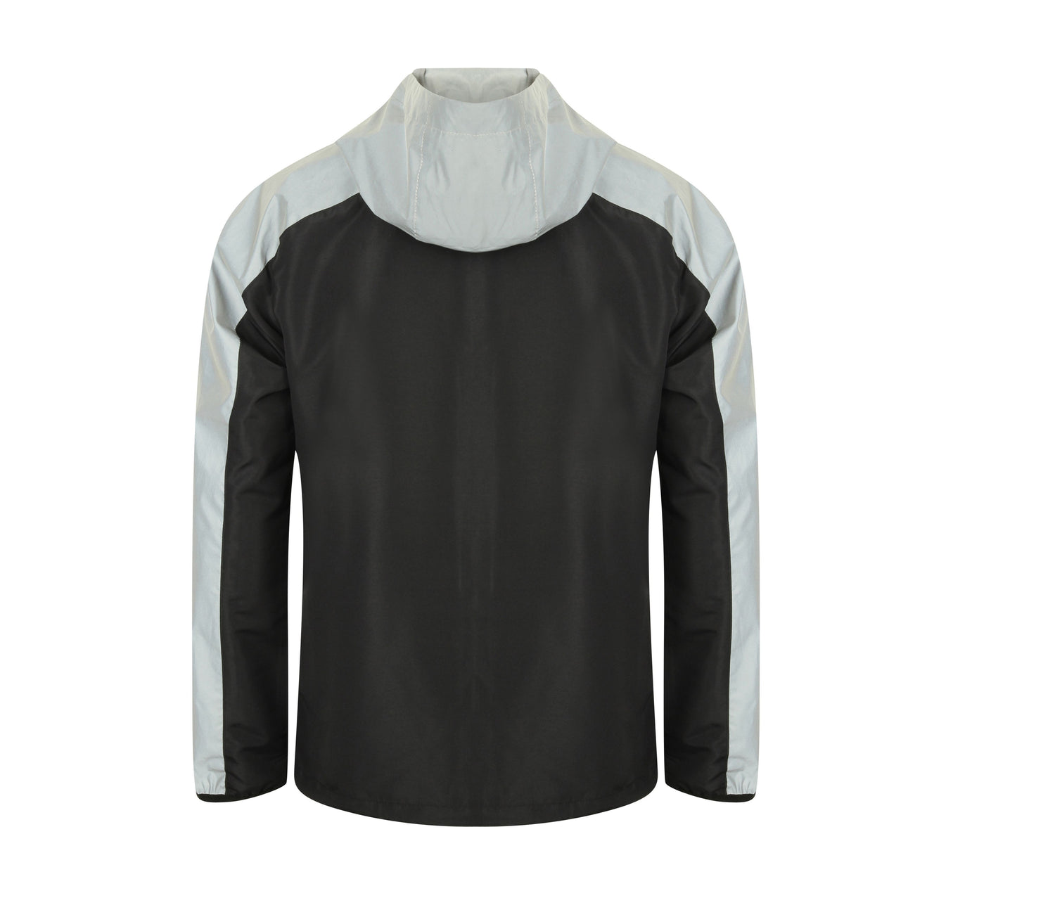 Winddicht, wasserdicht und atmungsaktiv. Reflektierend an Brust und Ärmeln. 3-teilige Kapuze mit Schnürband und verstellbaren Stoppern.