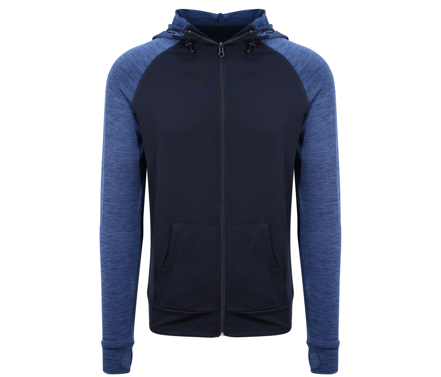 Raglanärmel in Kontrastfarben. Kängurutasche. Durchgehender Reißverschluss. Schnell trocknend.