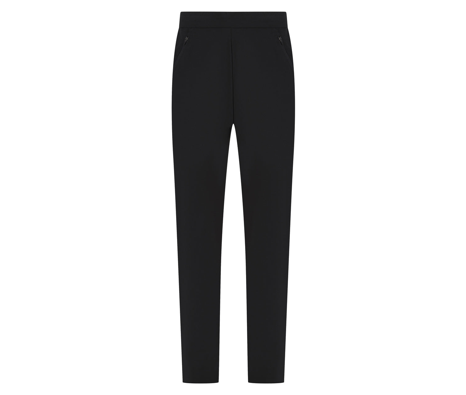 Beine in spitz zulaufender Form. Flacher Gürtel mit Gummizug und abnehmbarem Etikett. Seitentaschen und Gesäßtaschen mit Reißverschluss.